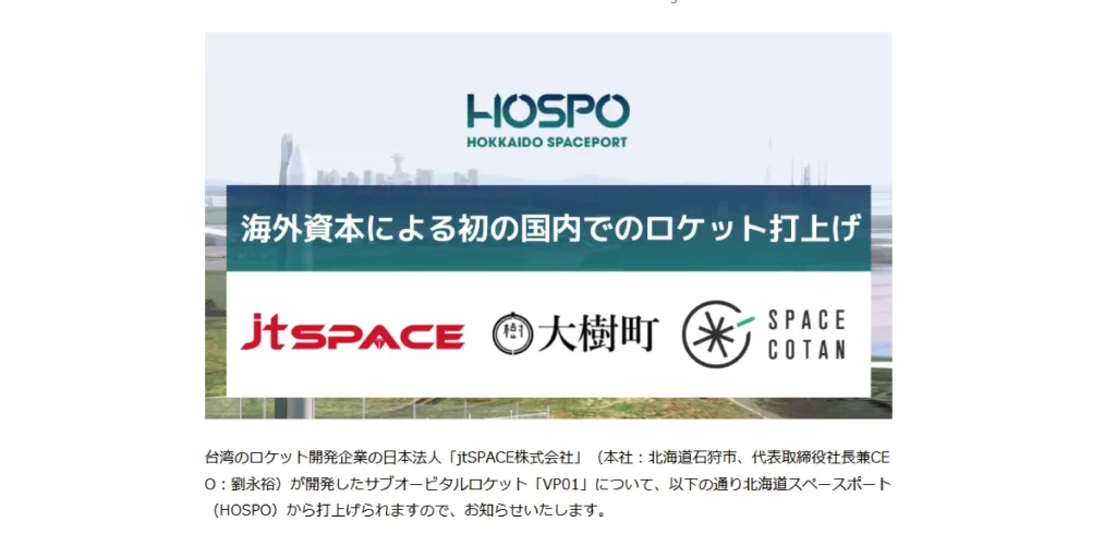 台湾のロケット開発企業の日本法人「jtSPACE株式会社」(本社:北海道石狩市、代表取締役社長兼CEO:劉永裕)が開発したサブオービタルロケット「VP01」について、以下の通り北海道スペースポート(HOSPO)から打上げられますので、お知らせいたします。